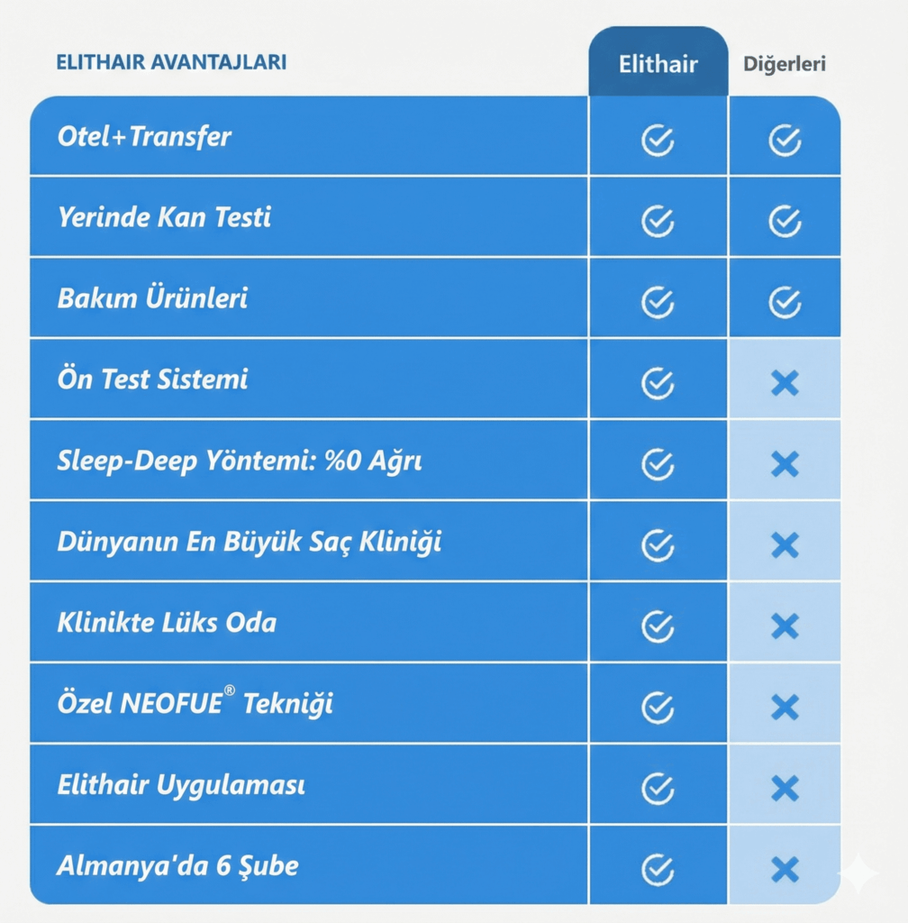 Genel olarak, Türkiye’de saç ekimi maliyeti Almanya’dakinden çok daha düşüktür. Elithair’de tüm hastalar, otel, transfer veya sonrası bakım gibi birçok hizmeti kapsayan her şey dahil bir paket alırlar.